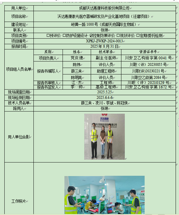 成都沃达惠康科技股份有限公司职业病危害因素控制效果评价
