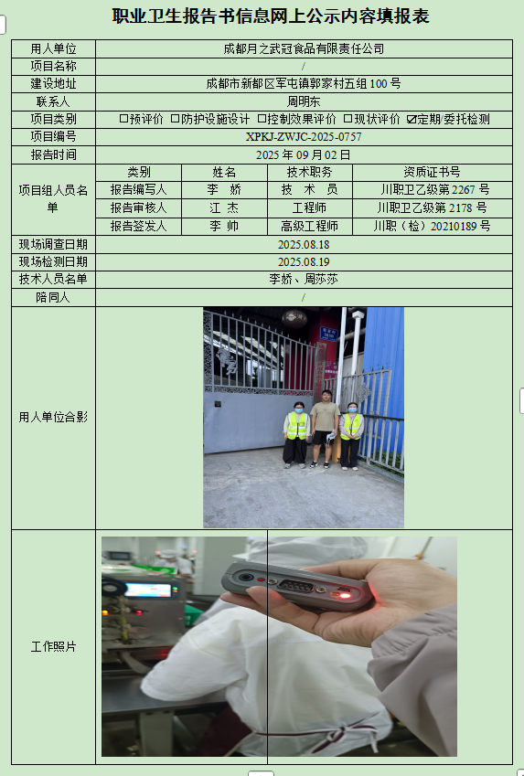 成都月之武冠食品有限责任公司职业病危害因素定期检测