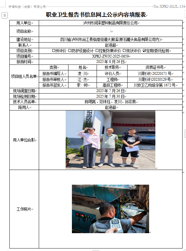 泸州市润泽塑料制品有限责任公司职业病危害因素定期检测