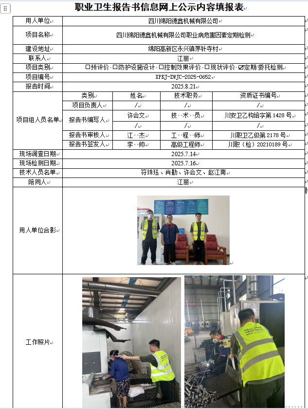 四川绵阳德鑫机械有限公司职业病危害因素定期检测