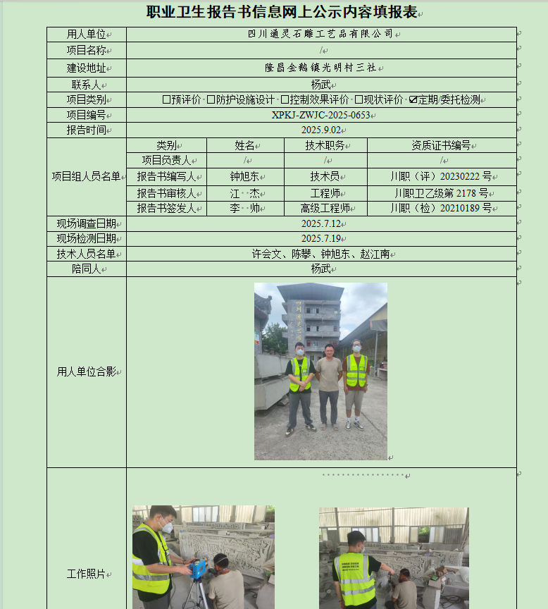 四川通灵石雕工艺品有限公司职业病危害因素定期检测