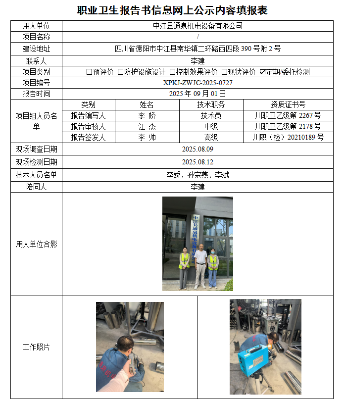 中江县通泉机电设备有限公司职业病危害因素定期检测
