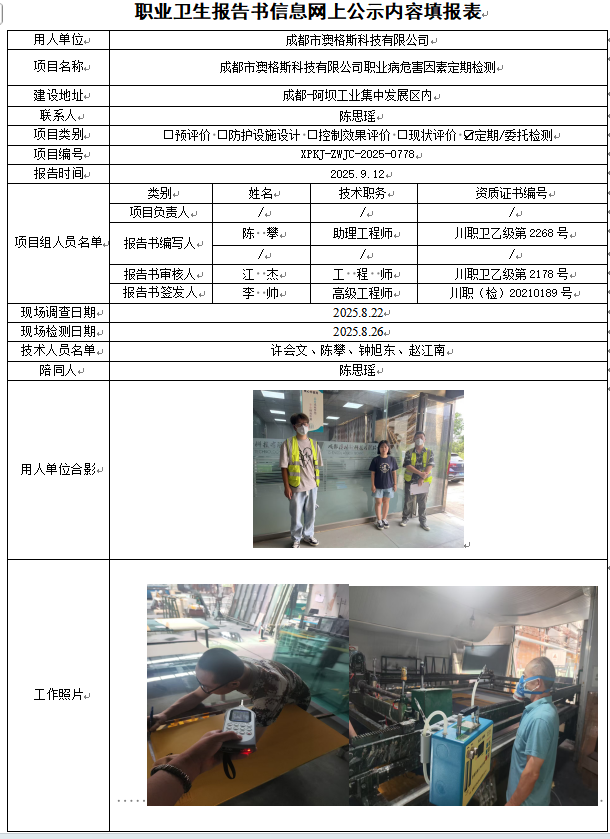 成都市澳格斯科技有限公司职业病危害因素定期检测