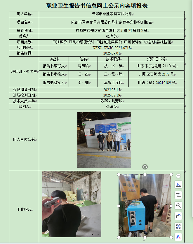 成都市泽胜家具有限公司职业病危害因素定期检测
