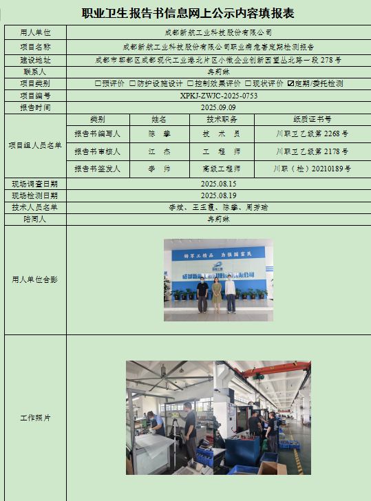 成都新航工业科技股份有限公司职业病危害因素定期检测
