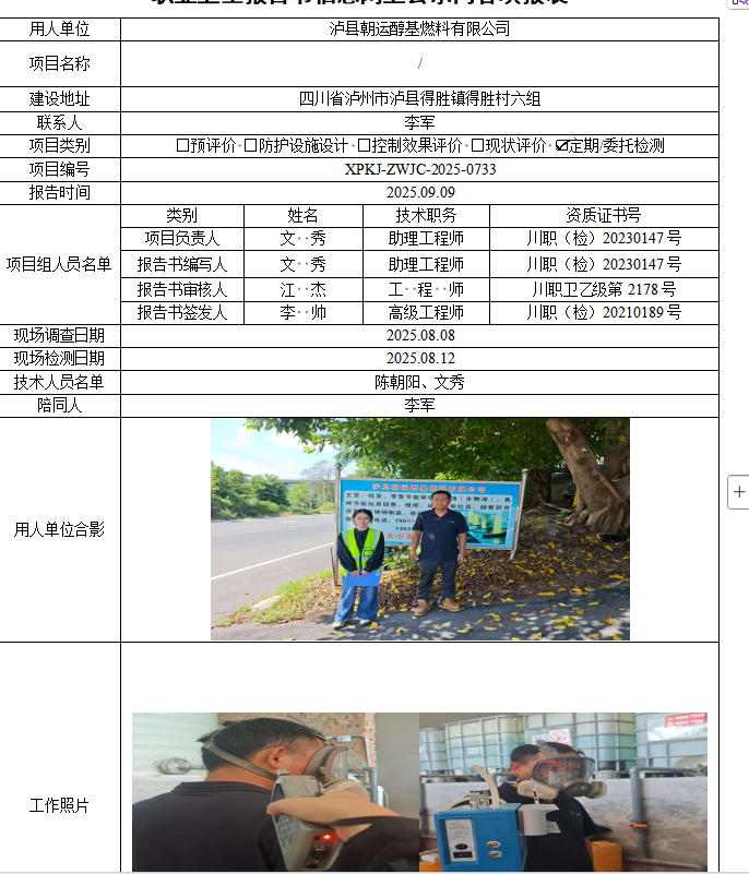 泸县朝运醇基燃料有限公司职业病危害因素定期检测