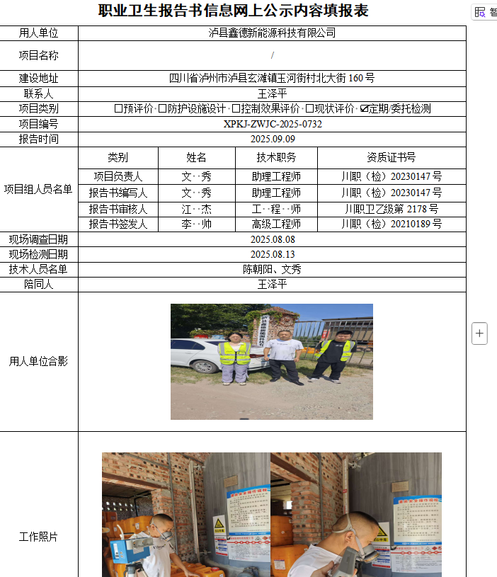 泸县鑫德新能源科技有限公司职业病危害因素定期检测