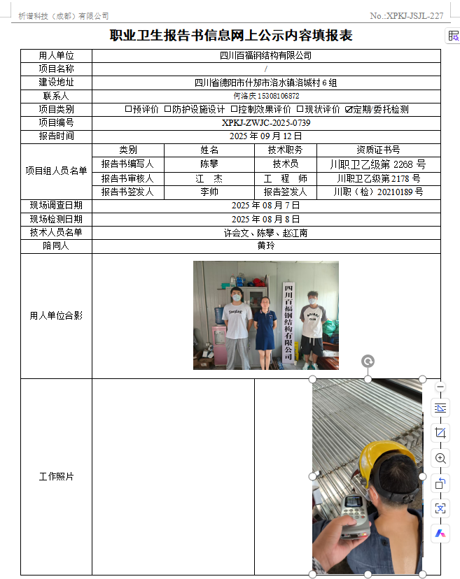 四川新概念青铜时代艺术品有限责任公司职业病危害因素定期检测