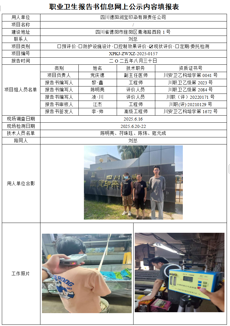 四川德阳润宝印染有限责任公司职业病危害因素现状评价