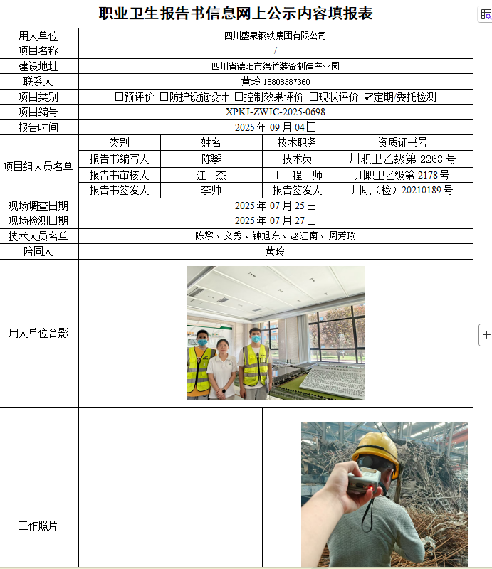 四川盛泉钢铁集团有限公司职业病危害因素定期检测