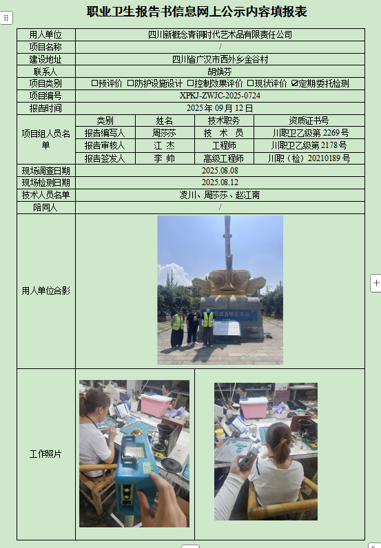 四川新概念青铜时代艺术品有限责任公司职业病危害因素定期检测