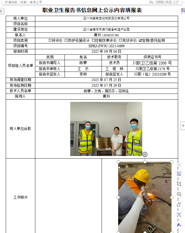 四川中盛南废旧物资回收有限公司职业病危害因素定期检测