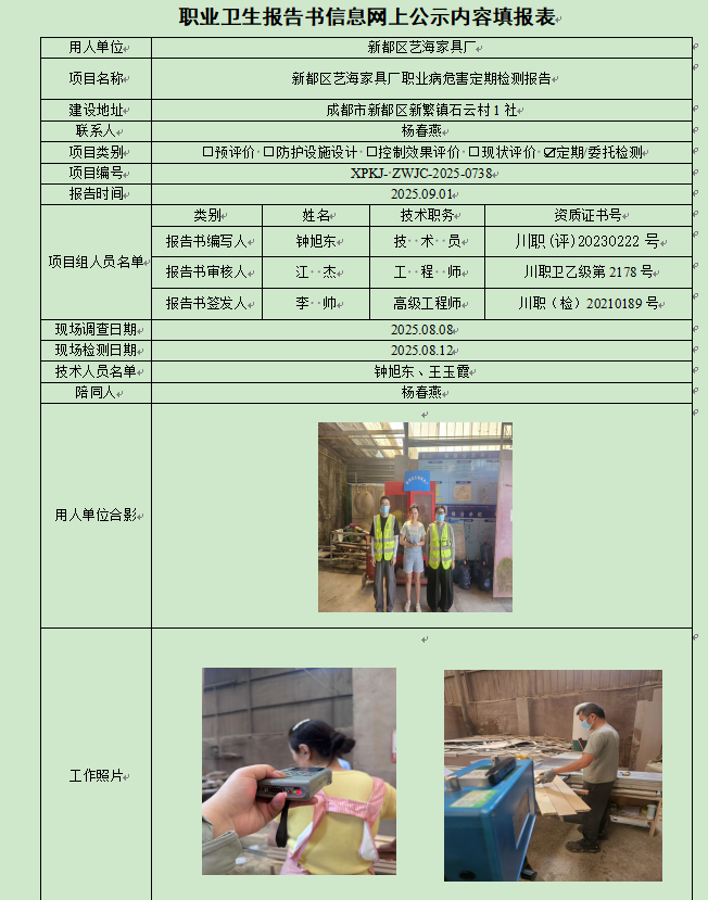 新都区艺海家具厂职业病危害因素定期检测