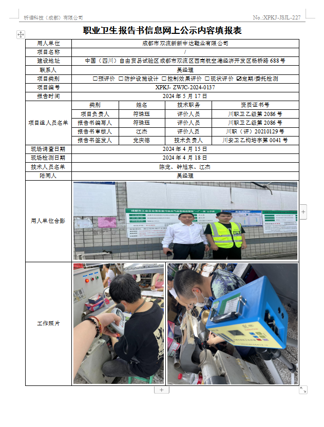 成都市双流新新中达鞋业有限公司定期检测