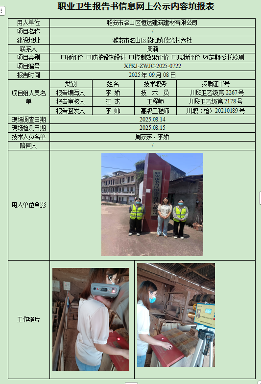 雅安市名山区恒达建筑建材有限公司职业病危害因素定期检测