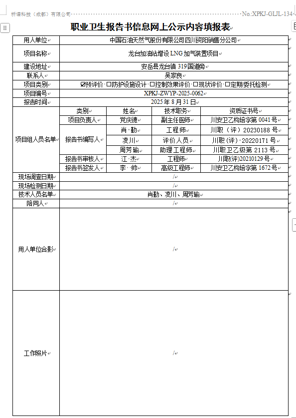 中国石油天然气股份有限公司四川资阳销售分公司安岳龙台加油站职业病危害因素预评价