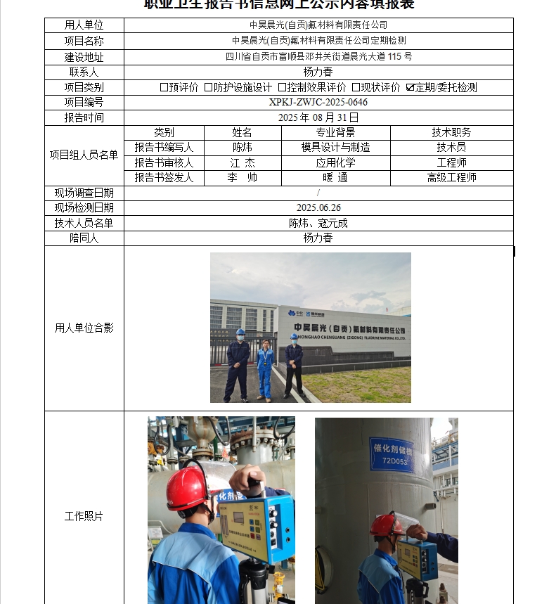 中昊晨光(自贡)氟材料有限责任公司职业病危害因素定期检测