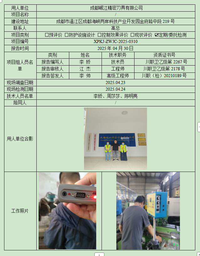 成都岷江精密刀具有限公司职业病危害因素定期检测