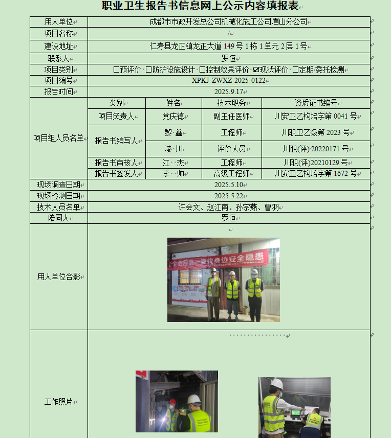 成都市市政开发总公司机械化施工公司眉山分公司职业病危害因素现状评价