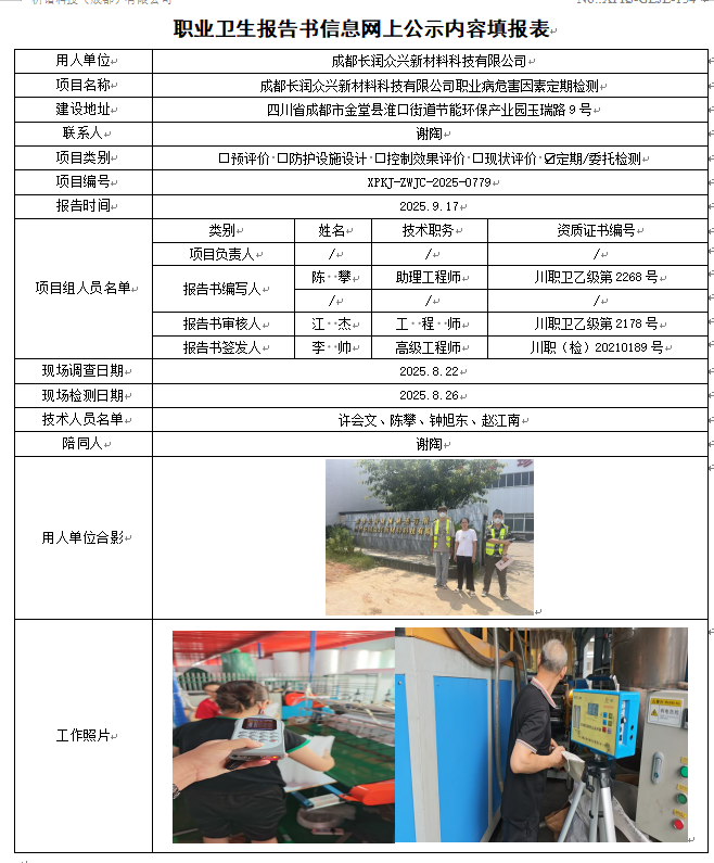 成都长润众兴新材料科技有限公司职业病危害因素定期检测