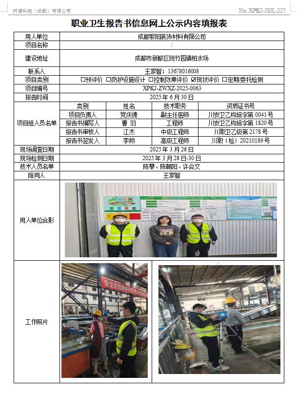 成都紫阳装饰材料有限公司职业病危害因素现状评价