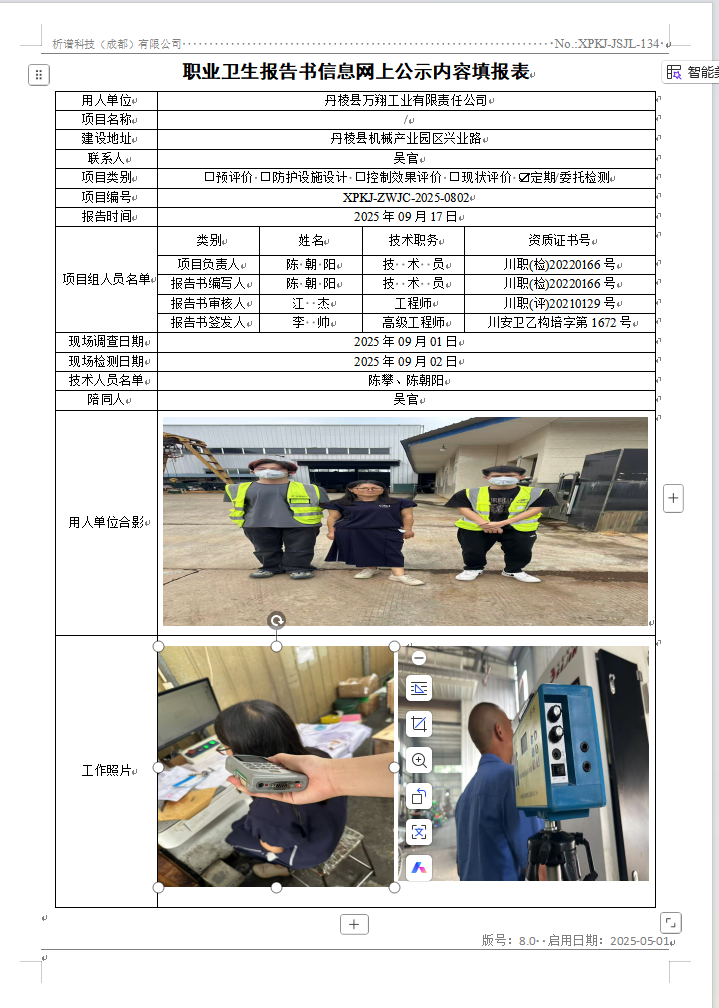 丹棱县万翔工业有限责任公司职业病危害因素定期检测