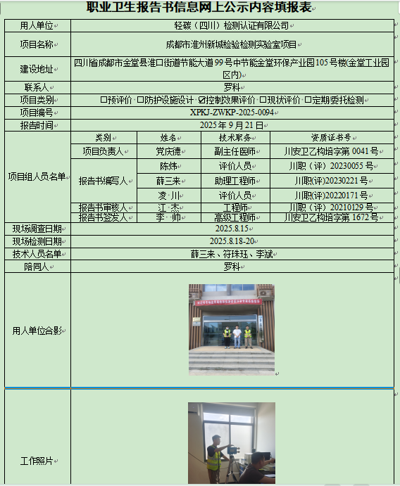 轻碳(四川)检测认证有限公司实验室职业病危害因素控制效果评价
