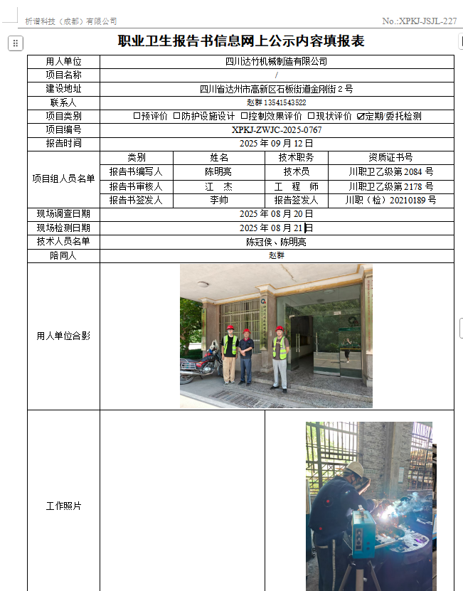 四川达竹机械制造有限公司职业病危害因素定期检测