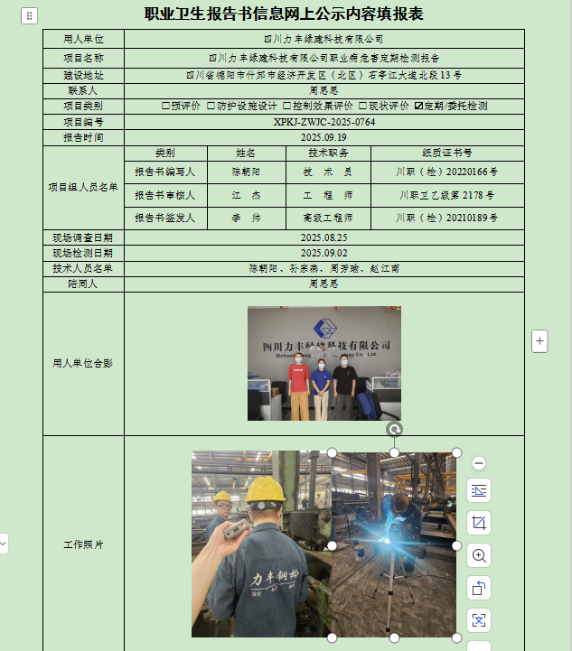 四川力丰绿建科技有限公司职业病危害因素定期检测