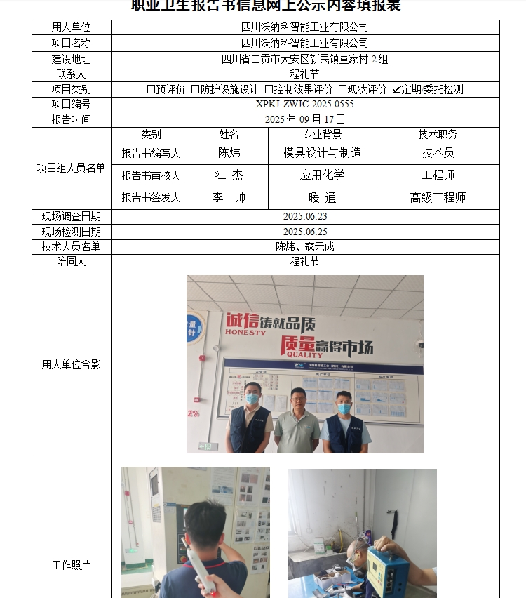 四川沃纳科智能工业有限公司职业病危害因素定期检测