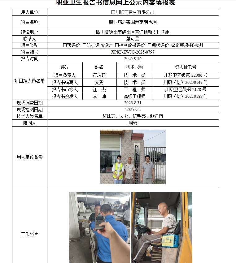 四川鑫鹏达科技有限公司职业病危害因素定期检测