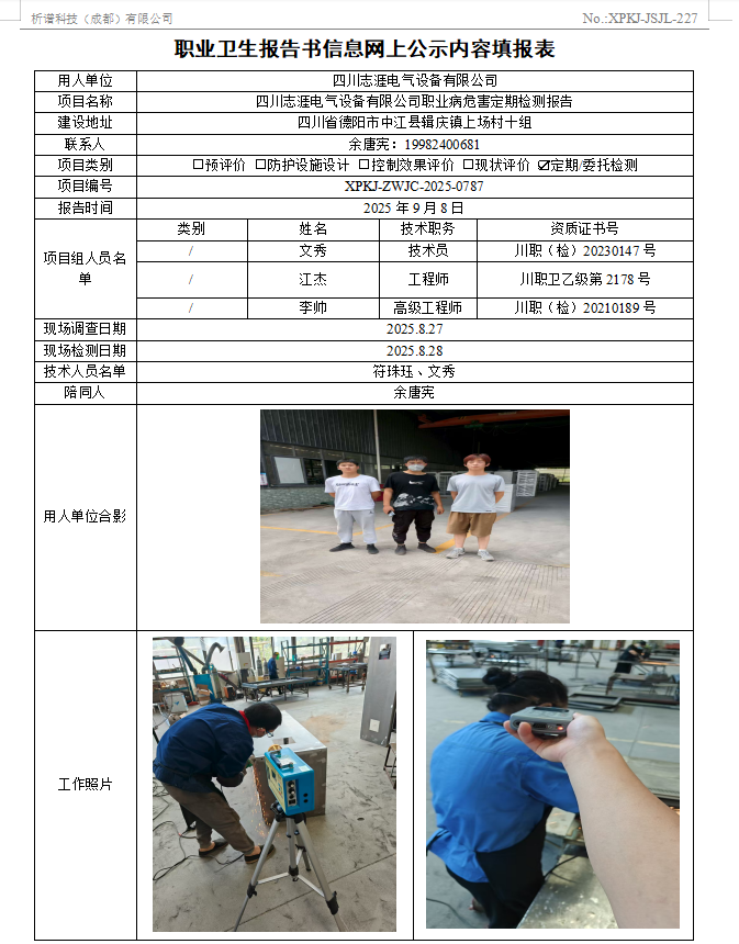 四川志涯电气设备有限公司职业病危害因素定期检测