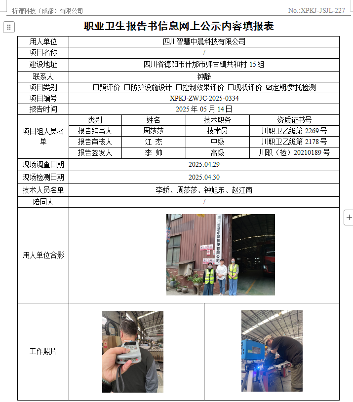 四川智慧中晨科技有限公司职业病危害因素定期检测