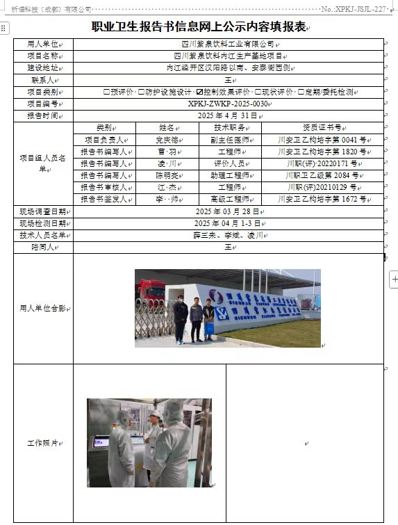 四川紫泉饮料工业有限公司职业病危害因素控制效果评价