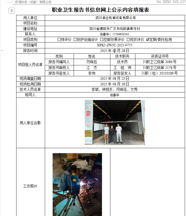 德阳佰业机械设备有限公司职业病危害因素定期检测
