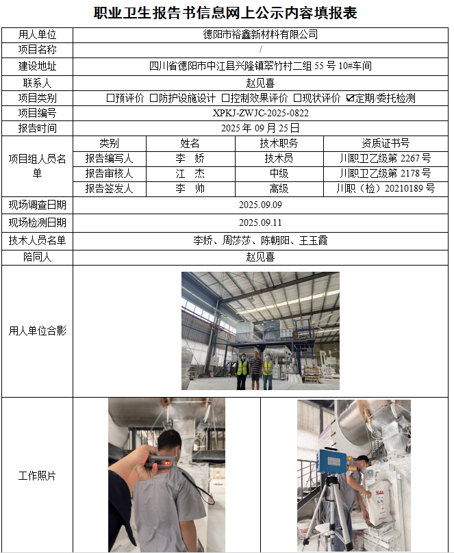 德阳市裕鑫新材料有限公司职业病危害因素定期检测