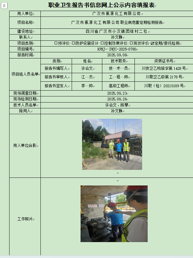 广汉市氨源化工有限公司职业病危害因素定期检测