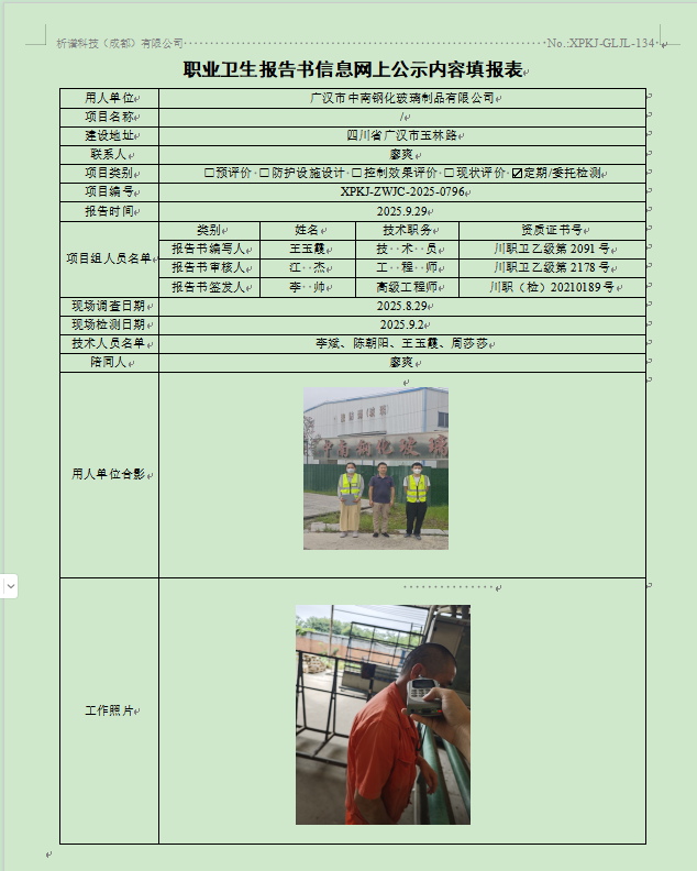 广汉市中南钢化玻璃制品有限公司职业病危害因素定期检测