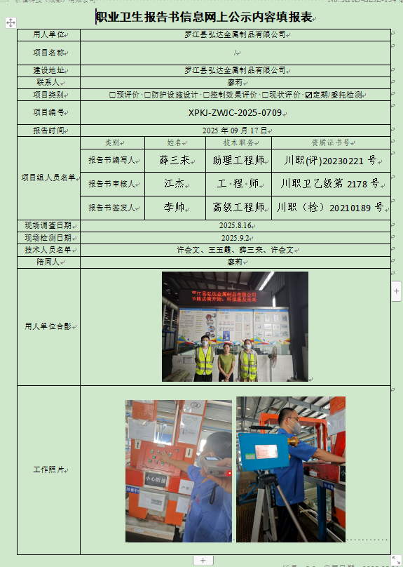 罗江县弘达金属制品有限公司职业病危害因素定期检测
