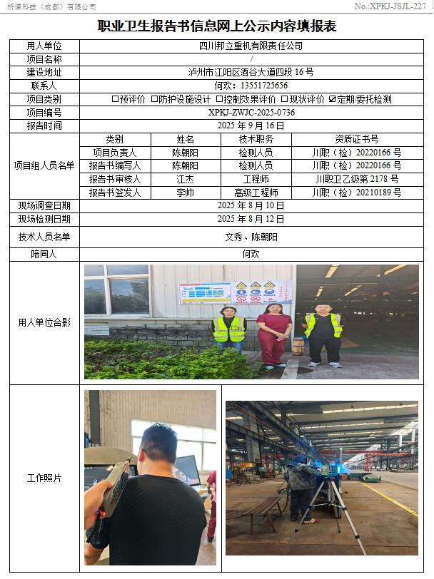 四川邦立重机有限责任公司职业病危害因素定期检测