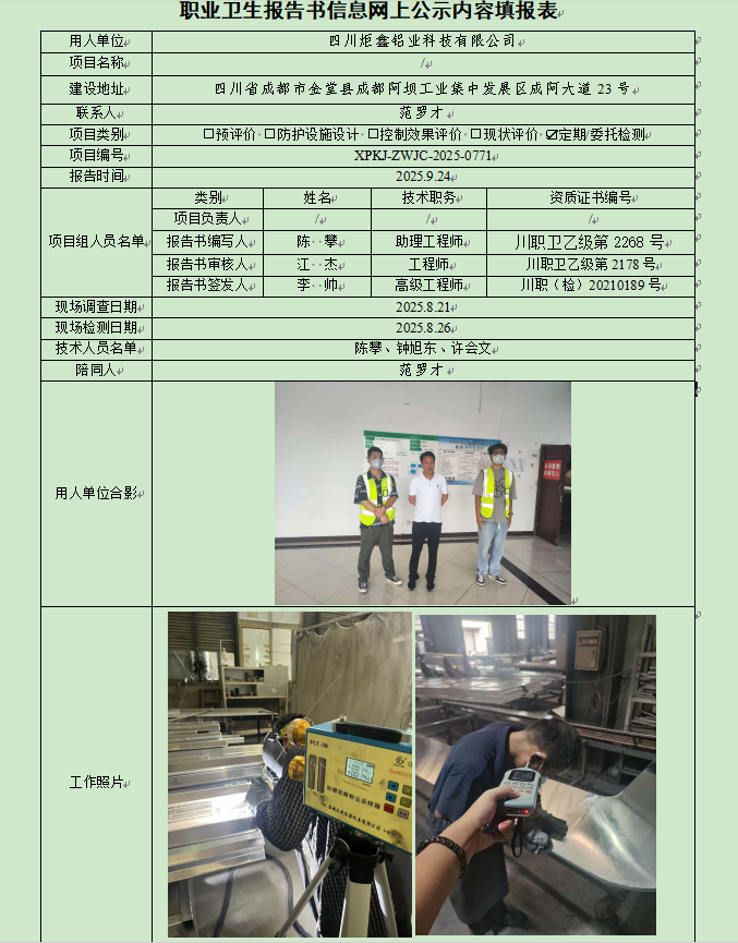 四川炬鑫铝业科技有限公司职业病危害因素定期检测