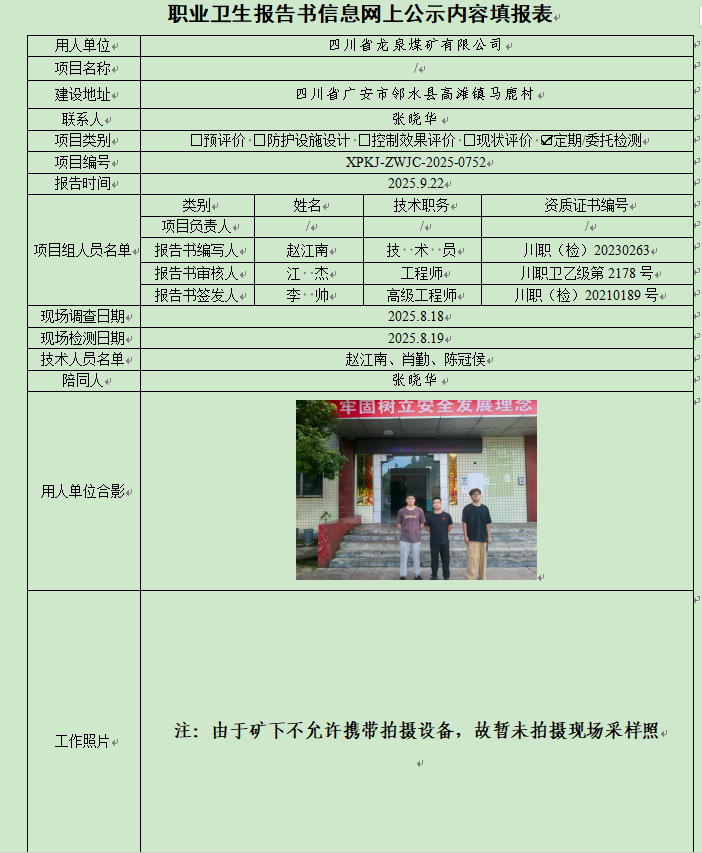 四川省龙泉煤矿有限公司职业病危害因素定期检测