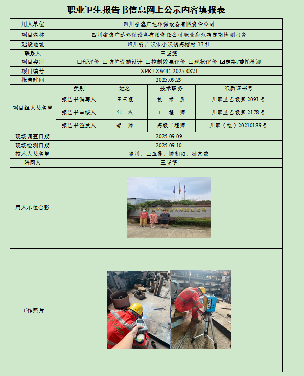 四川省鑫广达环保设备有限责任公司职业病危害因素定期检测