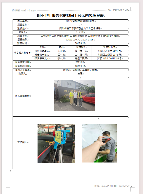 四川诗理特种玻璃有限公司职业病危害因素定期检测