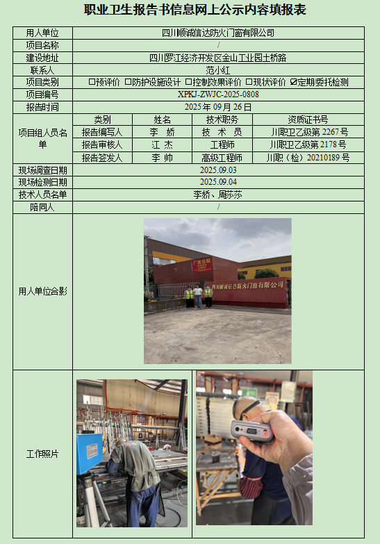 四川顺诚信达防火门窗有限公司职业病危害因素定期检测