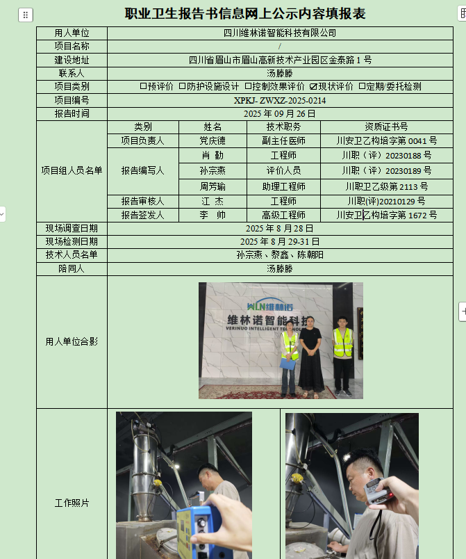 四川维林诺智能科技有限公司职业病危害因素现状评价