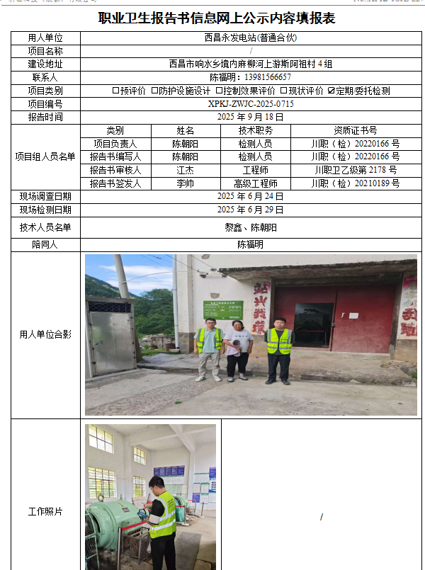 西昌永发电站(普通合伙)职业病危害因素定期检测