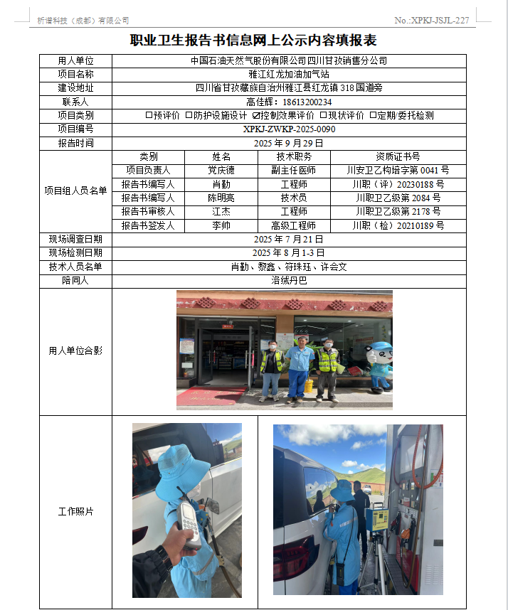 中国石油天然气股份有限公司四川甘孜销售分公司雅江红龙加油站职业病危害因素控制效果评价