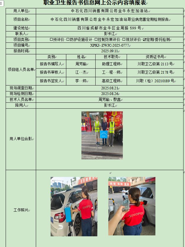 中石化四川销售有限公司金牛永宏加油站职业病危害因素定期检测