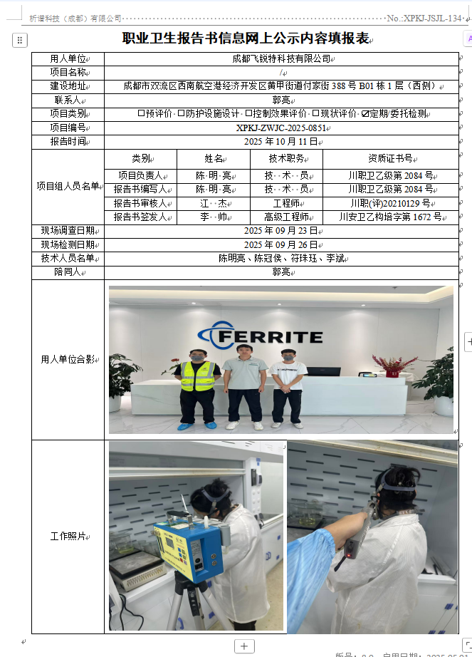 成都飞锐特科技有限公司职业病危害因素定期检测